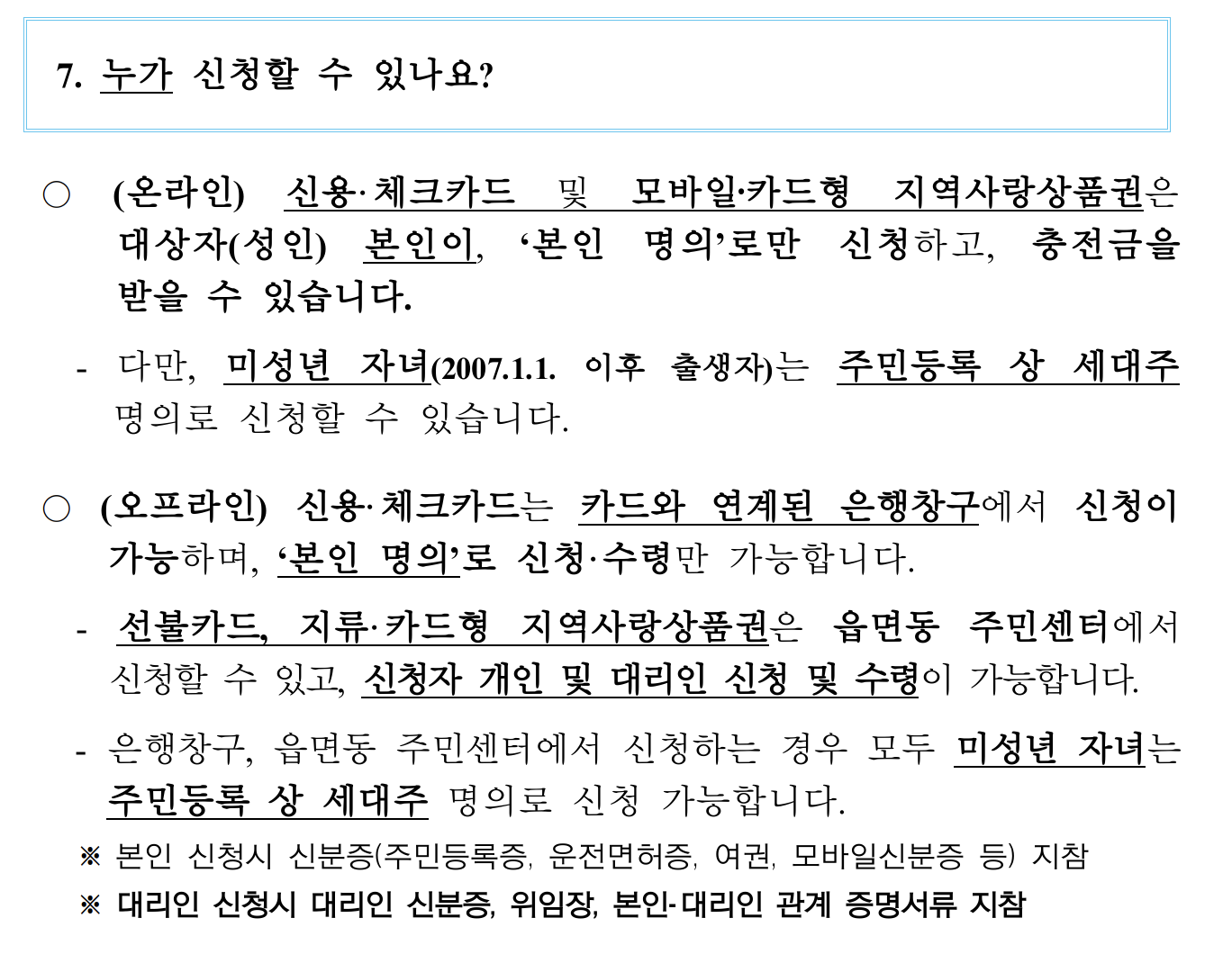 - 2007년 1월 1일 이후 출생자는 주민등록상 세대주 명의로 신청