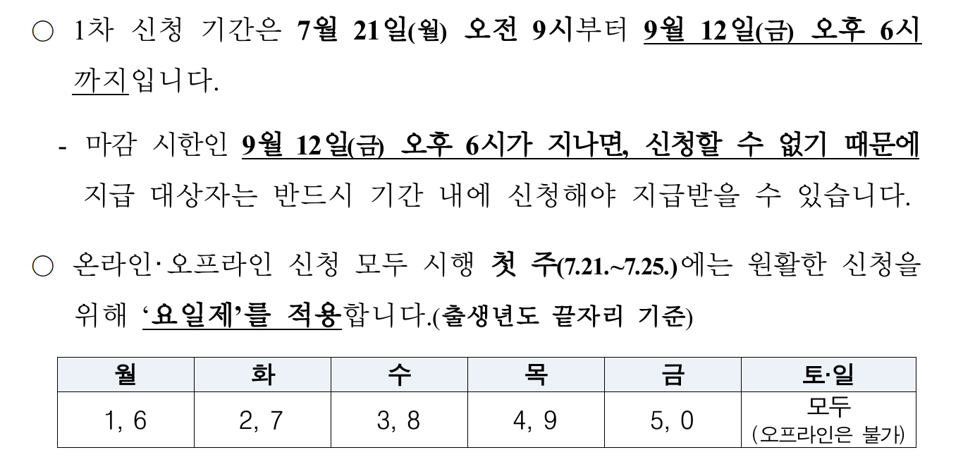 시작 첫 주 (7월 21일~25일)에는 시스템 과부하를 방지하기 위해 요일제가 적용됩니다.