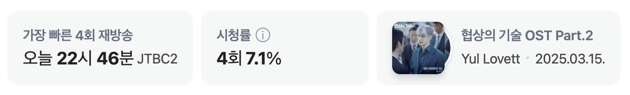 협상의 기술은 현재 4화까지 방영된 상태이며, 다음 회차를 놓치지 않으려면 본방, OTT 및 재방송 일정을 꼭 체크하세요!