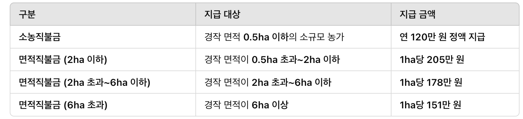 - 소농직불금: 경작 면적 0.5ha 이하 & 소규모 농가