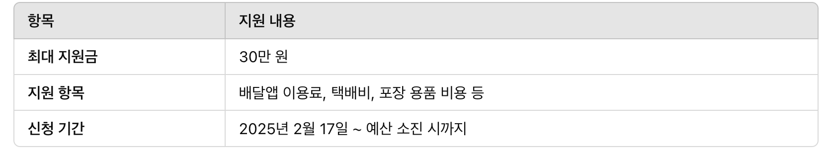 배달앱 수수료 및 택배비 부담을 줄이기 위해 정부 및 지자체에서 최대 30만 원 지원하는 사업이 운영 중입니다.