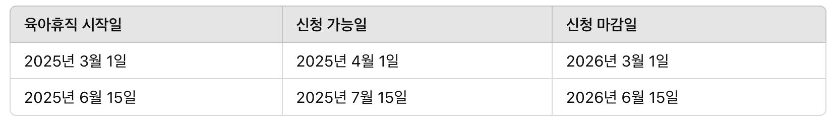 육아휴직 시작일신청 가능일신청 마감일