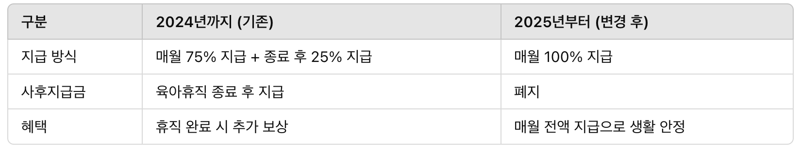 💡 중요: 2025년부터 사후지급금(25%) 폐지로 인해 육아휴직급여를 매월 100% 지급받을 수 있습니다!