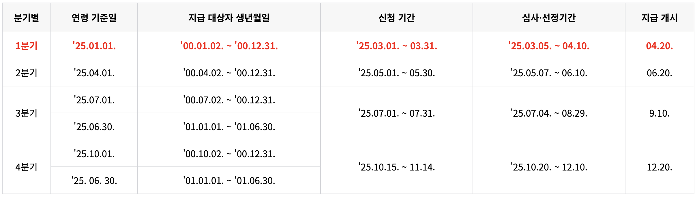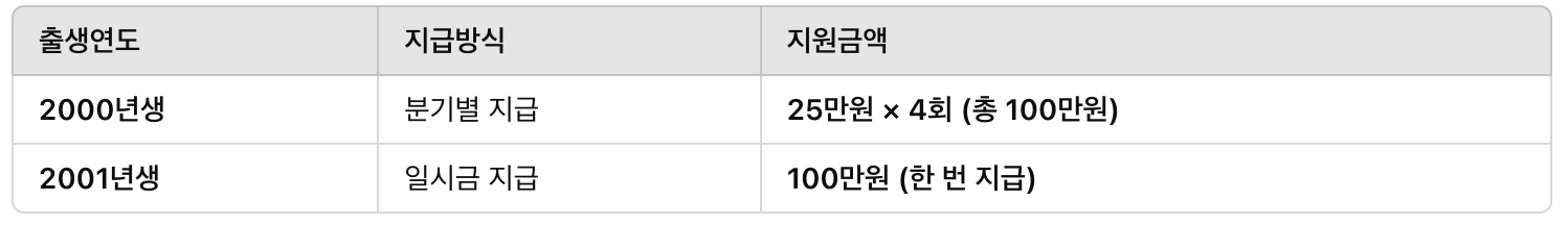 ✔ 지원금액: 분기별 25만원 (00년생) / 100만원 일시금 (01년생)