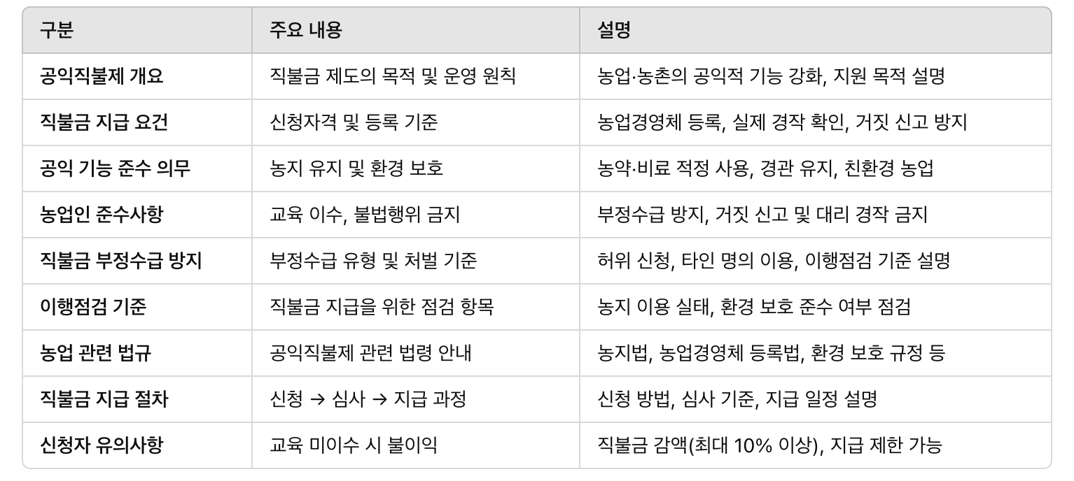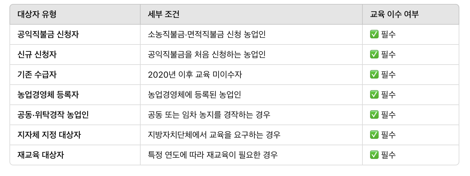 이 교육은 농업 환경 보호, 공익적 가치 증진 등을 목적으로 하며, 미이수 시 직불금 지급이 제한될 수 있습니다.