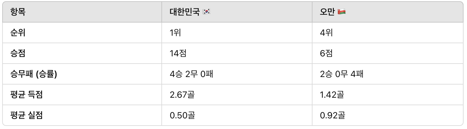 ✔ 오만과의 지난 경기 결과: 대한민국 3-1 오만